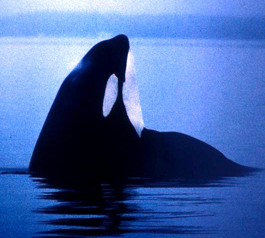 ![]() Elder male Ruffles (J1), age 57, spyhops off Vashon Island. Photo © Mark Sears |